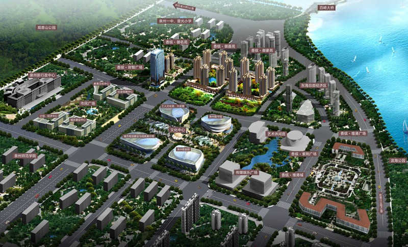 市府中央軸,沿8000畝森林公園、2000畝觀音山從北到南依次為泉州新行政中心、市政廣場、市民廣場(城市規(guī)劃建設(shè)與展覽館、文化宮、泉州歌劇院、泉州圖書館)、傳媒娛樂廣場、香繽紫荊廣場、700畝最美“外灘”。于龍口寶地立足泉州的百年發(fā)展,以城市核心資源的高度占有,將政治與人文藝術(shù)完美融合。